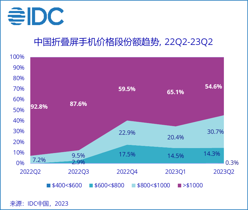值得一提的是,隨著技術的成熟和良品率的提升,以及相關物料價格處于低谷,折疊屏手機的成本不斷下降,售價也越來越親民。IDC數據顯示,第二季度1000美元以上的折疊屏手機份額已經由一年前的92.8%下降到54.6%,同比下降38.2%。其中,豎折產品的價格更具有吸引力,目前市面上價格最低的豎折產品已經下探到400~600美元價格段。而第二季度豎折產品的市場份額已經達到折疊屏手機市場的46.6%,同比增長10.4%。消費端購買意愿增長乏力后,折疊屏手機成了廠商“開卷”的戰場。