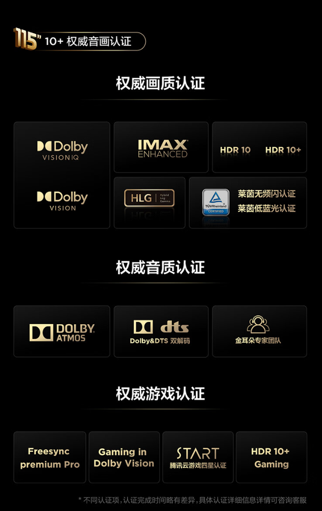 這款電視采用了 TCL 華星出品的高端 VA 屏 A++ 蝶翼星曜屏,搭載領曜芯片 M2+TXR Mini LED 畫質增強芯片、安橋 6.2.2 Hi-Fi 音響、靈控桌面 UI 和纖薄一體化設計,全鏈路支持無損 4K 144Hz、VRR、MEMC、環境光自適應等,還通過了雙杜比、IMAX、HLG、HDR 10+、萊茵無頻閃以及低藍光認證。
