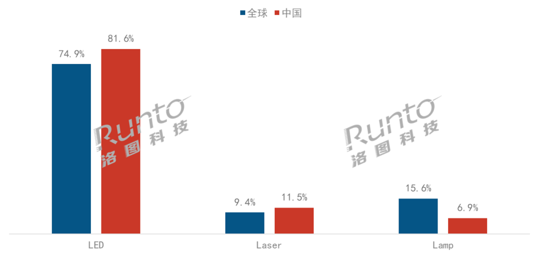 2023H1 全球及中國投影機市場按出貨量光源結構