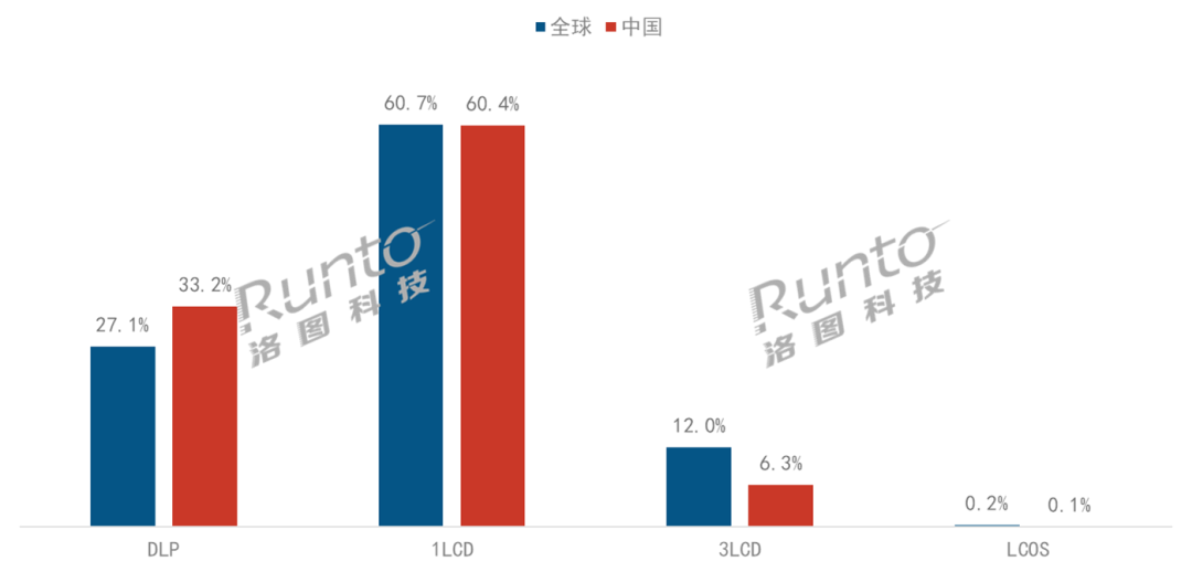 DLP技術份額相對穩定,維持在25%~30%左右。2023年上半年,DLP在全球市場的占比達到27.1%,在中國市場的占比則為33.2%。