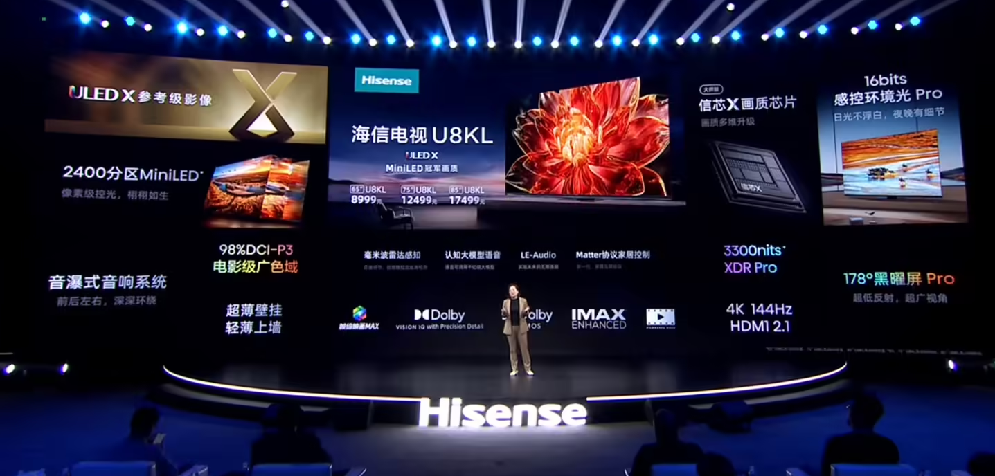 據介紹,海信 U8KL 擁有最高 2400 分區 MiniLED 屏,支持 98% DCI-P3 色域、4K 144Hz HDMI 2.1 高刷、最高 3300nits 亮度、16bits 感控環境光 Pro,搭載信芯 X 畫質芯片,以及 178° 黑曜屏 Pro 抗反射。