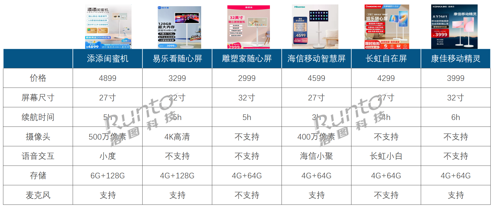 洛圖科技(RUNTO)整理了當前在售的移動智慧屏暢銷機型之后發現:在品類發展初期,各品牌機型間的屬性、參數差異并不是特別大。