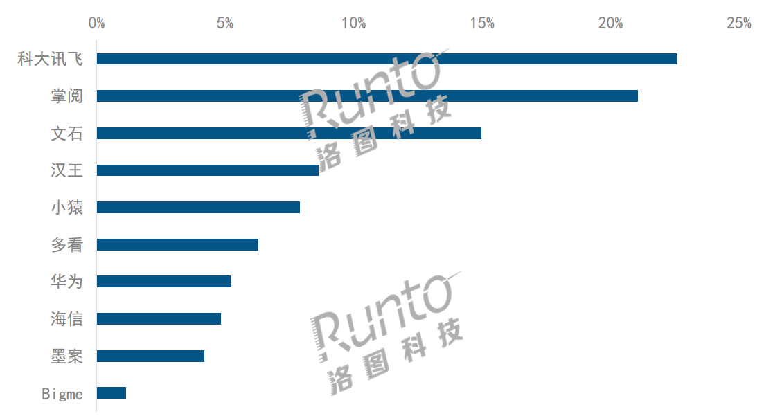 電子紙智能平板(不含Kindle)市場中,TOP5品牌為科大訊飛、掌閱、文石、漢王和小猿,8月合并份額為75.2%。科大訊飛連續三月蟬聯第一名;小猿“學練機”新品的熱度回落,影響其由7月的第四名下降到第五名;文石5月曾經在新品“Tab10C”、“Poke5”的助力下短暫升到第一名,8月已下降到第三名。