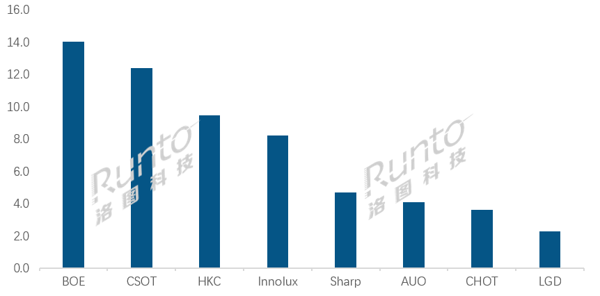 在市場格局發生斷尾之后,品牌格局陸續分化。腰部廠商集體轉為新的長尾陣營(年出貨1500萬片左右),而變革后的腰部陣營則出現斷檔。日系廠商Sharp(夏普)在第三季度的出貨量約為470萬片,同環比分別大幅增長36.2%和13.1%,市占率達到8%;臺系廠商AUO(友達)出貨約410萬片,同比大幅增長56%,成為第三季度增幅最大的工廠;只有一條G8.6產線的大陸廠商CHOT(彩虹光電)出貨量約360萬片,同比下降11.4%;韓系廠商LGD延續上半年的大幅下降趨勢,同比降幅達57.2%。