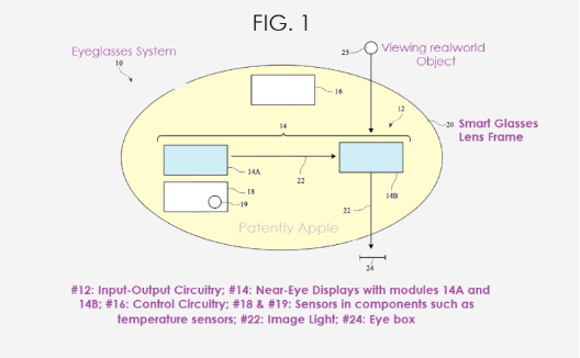 在(zai)第(di)二項智能(neng)眼(yan)鏡授權專利中,蘋果指出(chu),戴(dai)在(zai)用(yong)(yong)戶(hu)頭上的(de)頭戴(dai)式設備(例(li)如一副 AR 眼(yan)鏡)可(ke)用(yong)(yong)于為用(yong)(yong)戶(hu)提(ti)供計算機生成(cheng)的(de)內容,這些內容疊加在(zai)現實世(shi)界的(de)內容之上。用(yong)(yong)戶(hu)可(ke)以通過光(guang)學系統的(de)透(tou)明部分直接查看(kan)真(zhen)實世(shi)界的(de)內容。光(guang)學系統可(ke)用(yong)(yong)于將(jiang)圖像(xiang)從顯示系統中的(de)一個(ge)或(huo)多(duo)(duo)個(ge)像(xiang)素陣列或(huo)掃描設備傳輸到觀看(kan)者(zhe)的(de)眼(yan)睛。光(guang)學系統中可(ke)包(bao)括波(bo)導管,例(li)如由玻(bo)璃或(huo)塑料等透(tou)明材(cai)料的(de)一片或(huo)多(duo)(duo)片或(huo)其(qi)他導光(guang)材(cai)料形成(cheng)的(de)薄平面波(bo)導管,以將(jiang)圖像(xiang)光(guang)從像(xiang)素陣列傳送到觀看(kan)者(zhe)。
