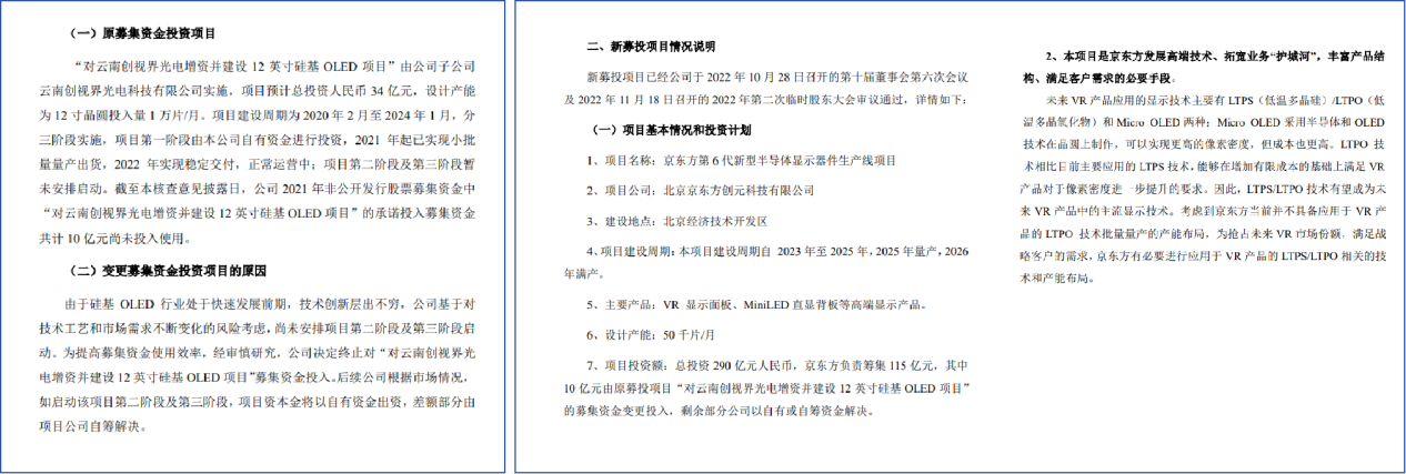10月31日,京(jing)(jing)東(dong)方(fang)發布公告稱,決定(ding)終止對(dui)“對(dui)云南創(chuang)視界(jie)光(guang)電增資(zi)并建(jian)設12英寸硅基(ji)OLED項(xiang)(xiang)目”募集資(zi)金(jin)10億元投入,并將資(zi)金(jin)變更至(zhi)“京(jing)(jing)東(dong)方(fang)第6代新(xin)型半導(dao)體顯示(shi)(shi)器(qi)件生產(chan)線項(xiang)(xiang)目”資(zi)本性支出(chu)。京(jing)(jing)東(dong)方(fang)表示(shi)(shi),由于硅基(ji)OLED行(xing)業(ye)處(chu)于快(kuai)速發展(zhan)前期,技術創(chuang)新(xin)層出(chu)不(bu)窮(qiong),公司基(ji)于對(dui)技術工藝(yi)和市(shi)場需求不(bu)斷變化的(de)(de)風險考慮,尚未安排項(xiang)(xiang)目第二階(jie)段及(ji)第三階(jie)段啟動。“京(jing)(jing)東(dong)方(fang)第6代新(xin)型半導(dao)體顯示(shi)(shi)器(qi)件生產(chan)線項(xiang)(xiang)目”主(zhu)要(yao)為VR顯示(shi)(shi)面板(ban)、Mini LED直顯背板(ban)等高端顯示(shi)(shi)產(chan)品,其中VR顯示(shi)(shi)面板(ban)主(zhu)要(yao)采用LTPO技術。京(jing)(jing)東(dong)方(fang)的(de)(de)“改張易弦(xian)”無疑加(jia)劇了行(xing)業(ye)對(dui)硅基(ji)OLED未來不(bu)確定(ding)性的(de)(de)擔憂。