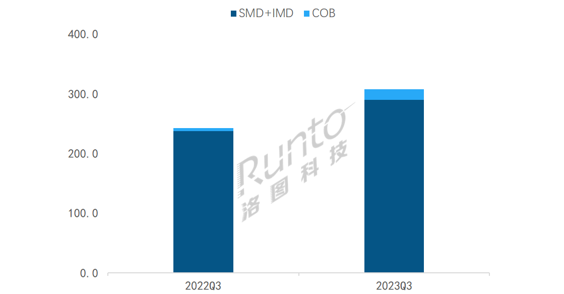 根據洛圖科技(RUNTO)數據顯示,2023年第三季度,中國大陸小間距LED顯示屏市場中,SMD(含IMD)封裝技術依然是主流,市占85.6%;然而,COB封裝技術同比增長了7.8個百分點,比重上升至14.4%,COB產品的出貨面積與同期比增長將近2.5倍。