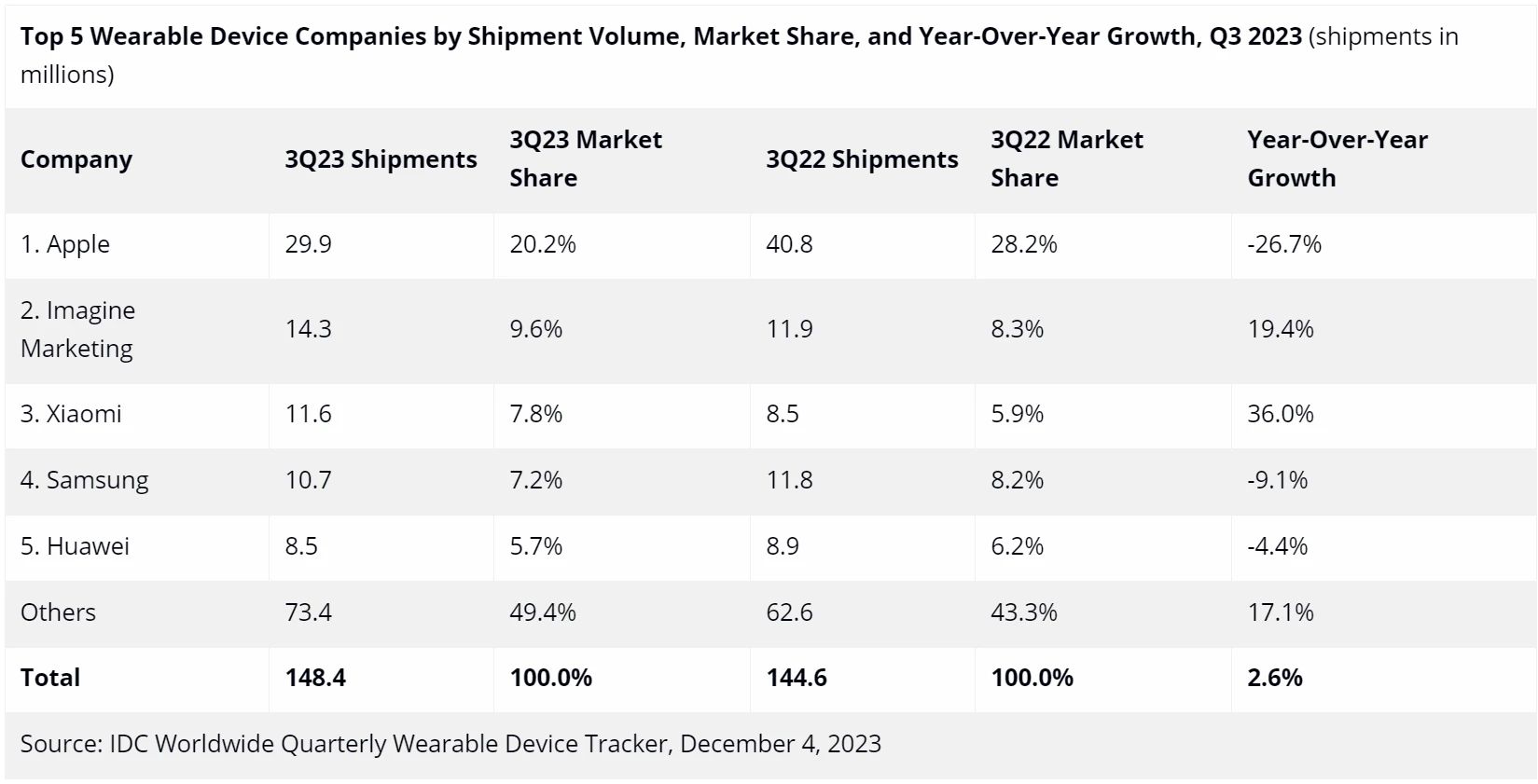 據IDC最新數據,2023年第三季度全球可穿戴設備出貨量同比增長2.6%,達到1.484億件的歷史最高水平。這種增長在很大程度上歸功于小品牌和新興品類的崛起。