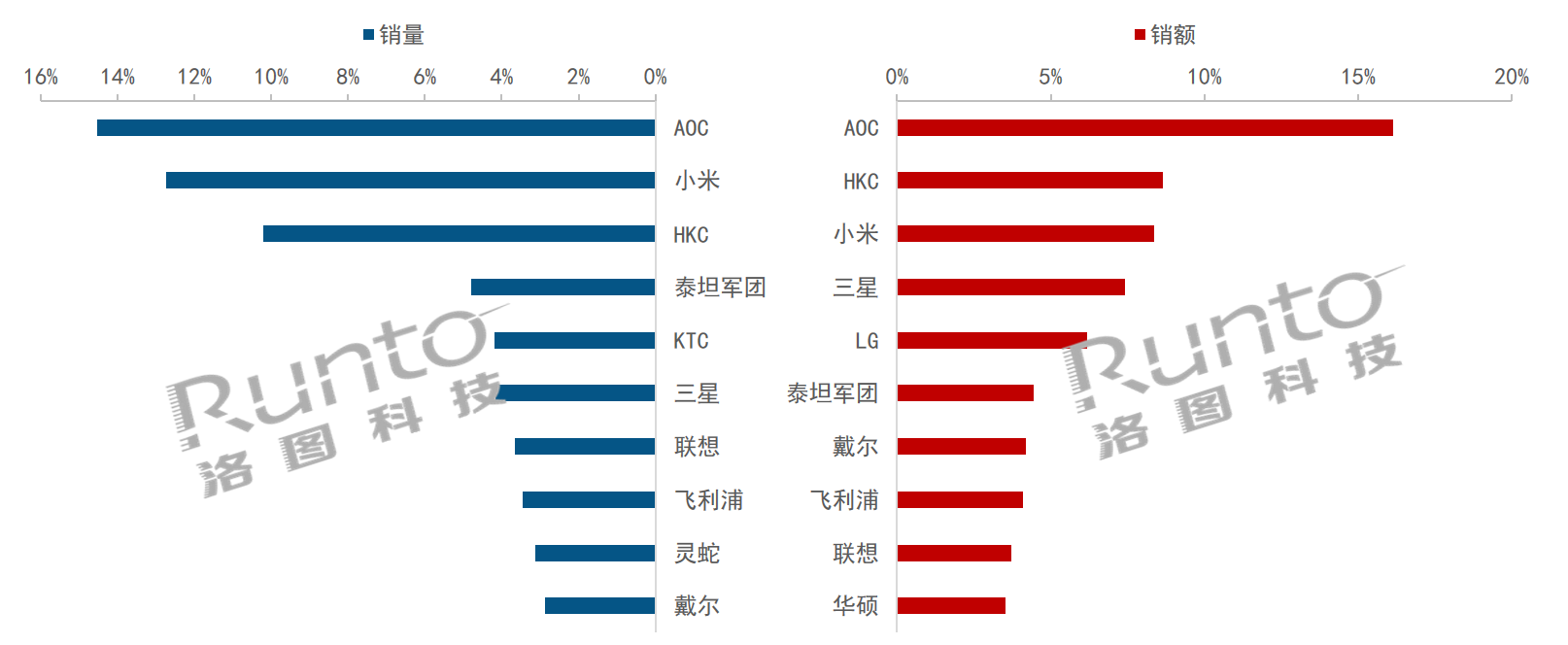 在銷額維度,AOC、HKC和小米仍然保持線上市場的前三位置。三星在Mini LED和OLED的中高端市場取得顯著成績,銷額躍居第四位;LG和華碩因在OLED產品的市場表現躋身前十,分別排名第五和第十位。