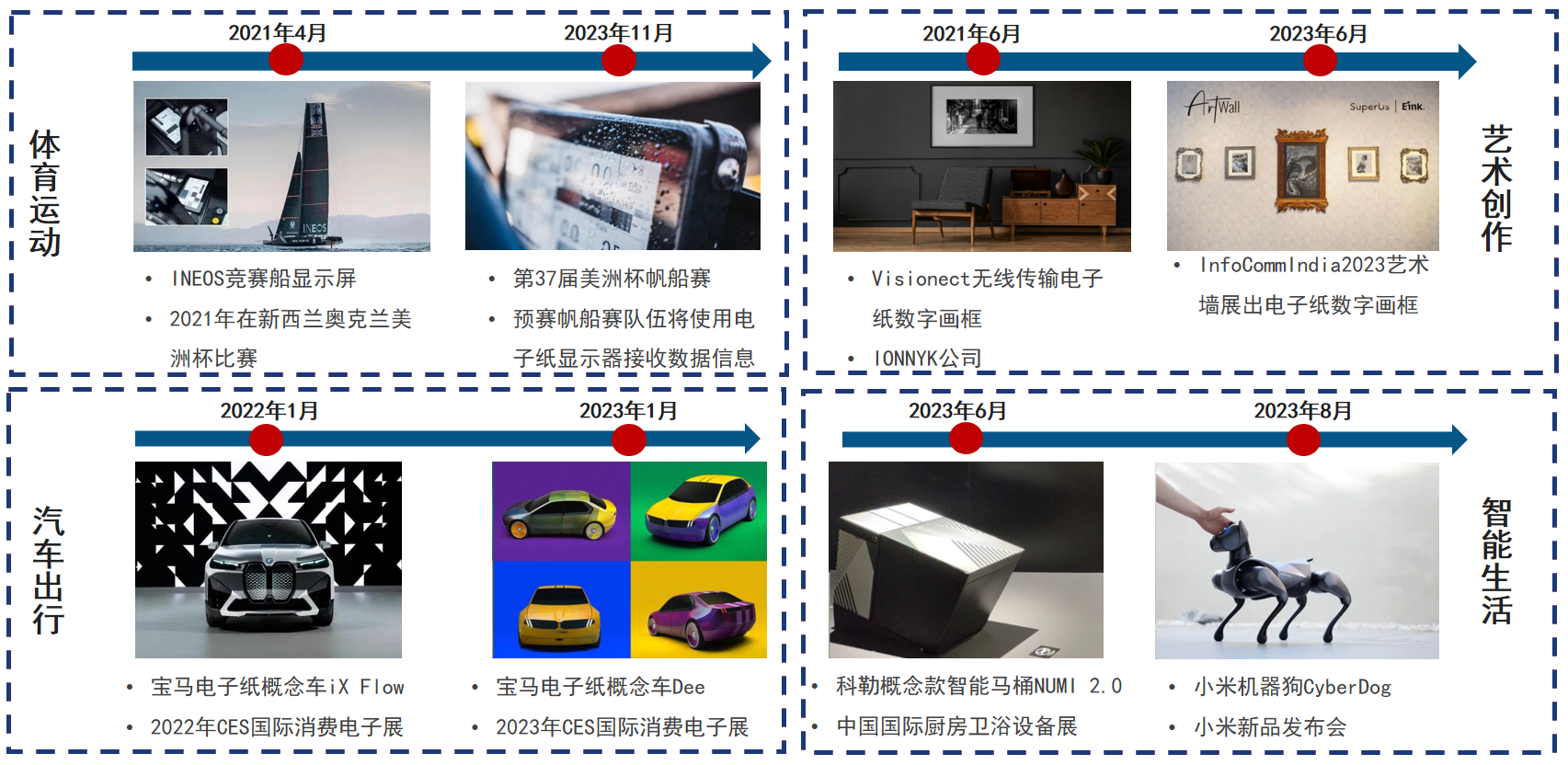 此外,除了以上幾類基礎產品和基礎應用場景之外,電子紙應用近年也花樣百出,各類具備創造性、示范性的終端產品不斷進入人們的視野。雖然大多數是概念產品,距離商業化尚有很漫長的過程,但它們的出現也為電子紙行業注入了生機和活力,提升了電子紙行業的想象空間,“電子紙+ X”成為行業新的關注點。