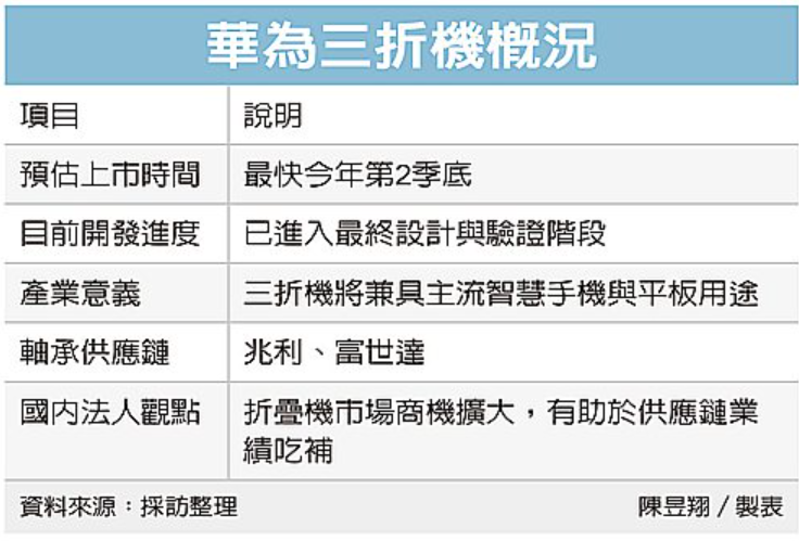 即便供應鏈低調不透露華為三折機新品動態,美聯社報導,華為去年起就已聯合供應商業者,全力研發三折手機,透過新產品讓用戶能一次擁有高階智慧手機與平板的用途,目前該產品已進入最終設計階段,隨時可進入量產階段,最快第2季有望上市。