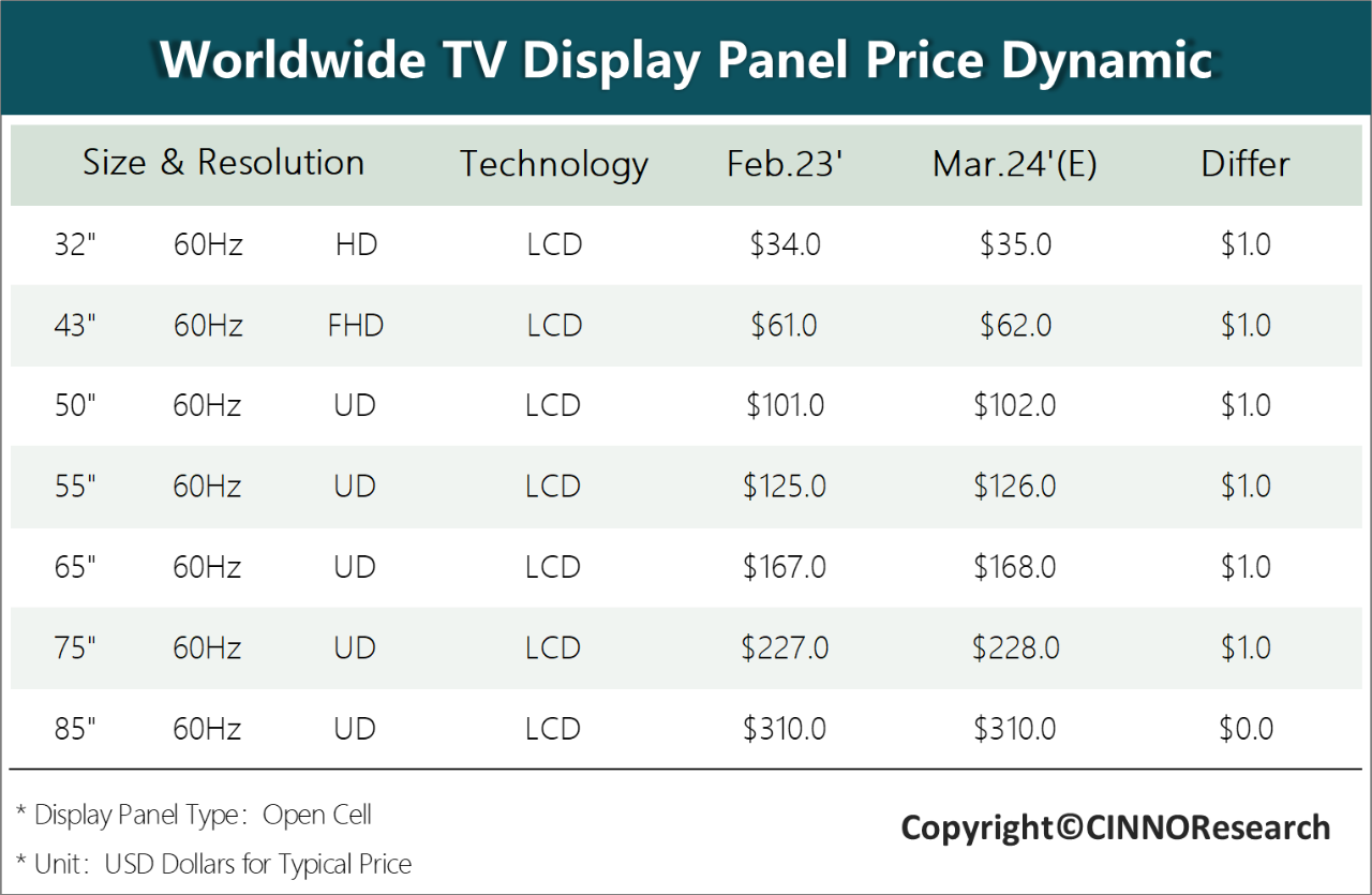 在即將進入3月的時間節點上,LCD TV面板供應整體依然偏緊。一方面2月各大面板廠按照原定計劃,在春節期間歲修控產,以穩定面板價格,壓縮了一部分面板供給,另一方面,開年之初日本能登地震對偏光片材料供應,特別是COP造成的負面影響仍在持續,并有可能延宕至5月。盡管各家偏光片廠庫存充足,暫未受到明顯影響,但如遲遲不能恢復供應,仍有可能影響后市。此外加之紅海地區局勢持續緊張,貨期難以保障,因此歐洲杯和奧運會相關備貨有所提前,國際品牌采購前移,國內品牌備貨策略也轉向積極,面板價格出現了微幅的全面回彈。