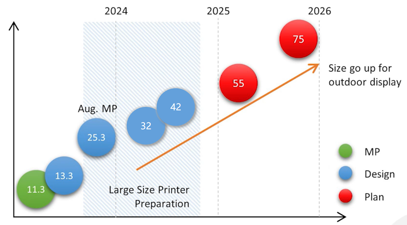 從產品尺寸來看,用于數字標牌的電子紙膜片產品中,已經量產和開發中的尺寸包括11.3、13.3、25.3、32、42寸等,未來三年內將規劃更大的55寸和75寸。