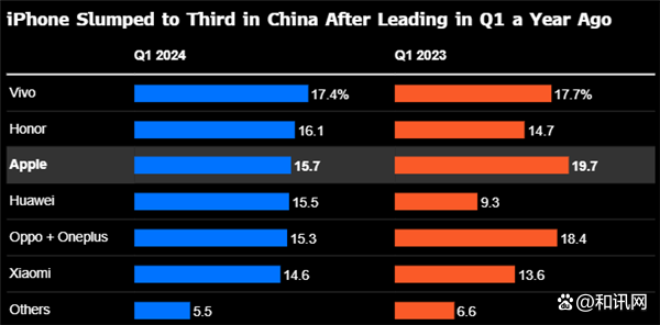 蘋果公司在競爭激烈的中國市場的排名跌至第三,與華為大致相當,而華為銷量卻增長近70%,明顯搶占了以往蘋果主導的高端市場。