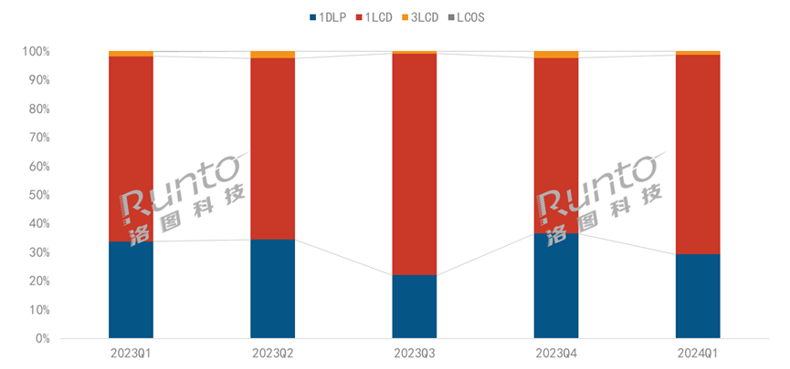 根據洛圖科技(RUNTO)線上監測數據顯示,2024年第一季度,DLP技術在線上市場的份額降到了三成以內,較去年同期下降了4.5個百分點。