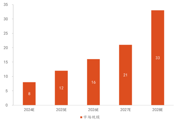 圖:2024-2028 年全球 Mini LED 直顯市場規模 預測(單位:億美元)