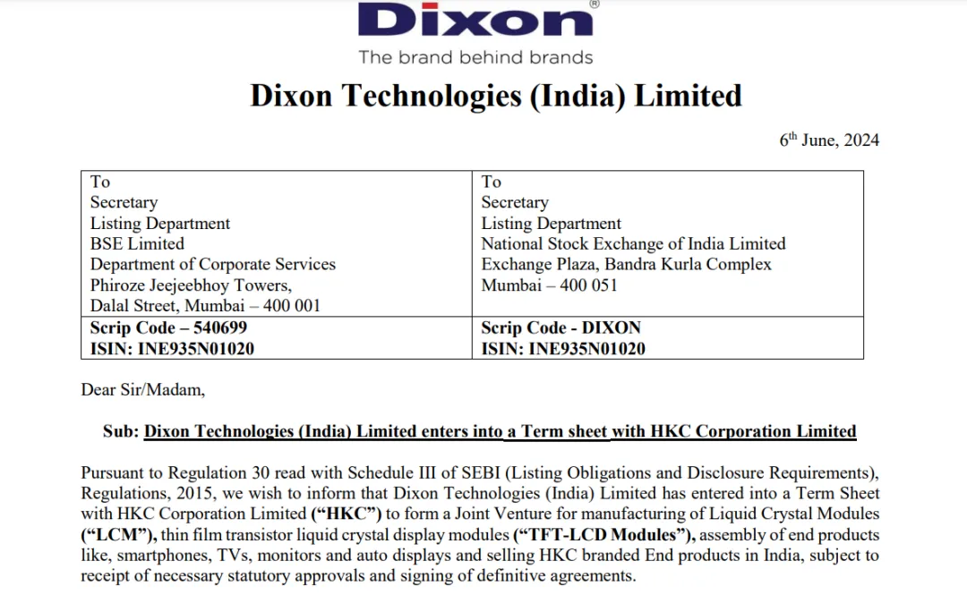 根據提交給孟買證券交易所和印度國家證券交易所的公司文件,迪森科技已與中國顯示器制造商惠科股份簽署了一份條款清單,以組建合資企業,目前正在等待必要的監管部門批準和最終協議。