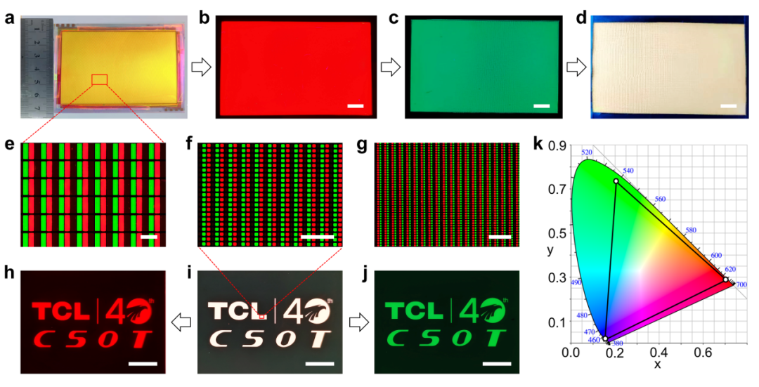 研究人員利(li)用(yong)該多粒子(zi)協同電泳沉積技(ji)術,在大(da)面積圖案面板(ban)上制(zhi)備了(le)紅(hong)綠雙(shuang)色多粒子(zi)共(gong)沉積陣列,成功實現了(le)超(chao)過(guo)1000 PPI的(de)高分(fen)辨(bian)的(de)全(quan)彩(cai)顯示(圖3),展(zhan)示了(le)在高效高分(fen)辨(bian)率(lv)顯示器(qi)中的(de)巨(ju)大(da)潛力(li)。