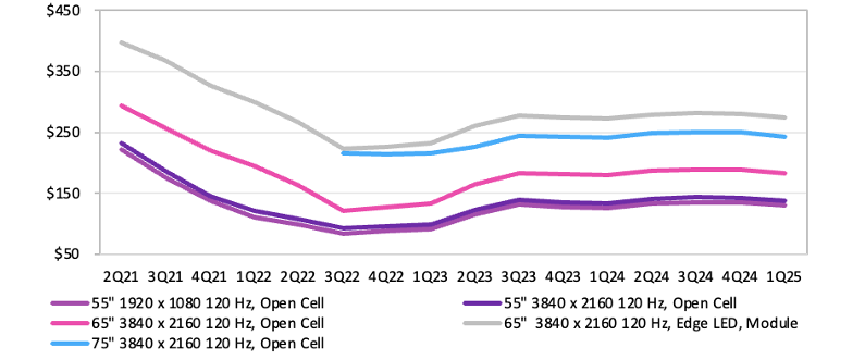 2021-2025年55英寸/65英寸/75英寸電視面板價格(來源:Omdia)