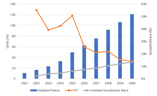 2020-2030 年可折疊智能手機出貨量(來源:Omdia)