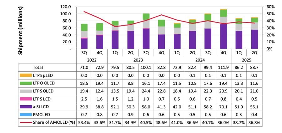 從出貨量和收入來看,智能手機是最大的應用領域。從出貨量來看,智能手表排名第二,而用于可折疊屏設備的顯示屏排名第三。隨著三星顯示、京東方和 LGD 8.6 代工廠投入量產,筆記本電腦和平板電腦顯示屏將是未來的主要變化。
