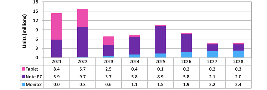 2021-2028 年MiniLED背光顯示IT面板出貨量(來源:Omdia)