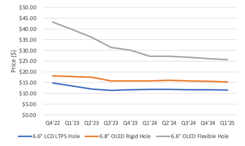 自 2022 年以來,剛性智能手機面板的價格一直保持穩定,LCD 和 OLED 之間的差價為 3 美元。由于所有中國面板制造商都開始以具有競爭力的產量生產,柔性 OLED 面板價格已下降 33%。