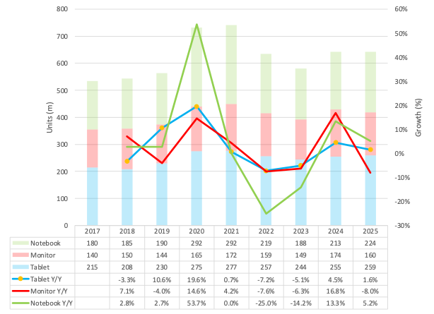 2017-2025年IT顯示器出貨量和增長率(資料來源:Omdia,OLED-A)
