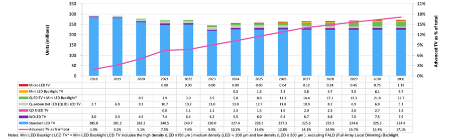 2018-2031先進電視出貨量(按技術劃分)預測(來源:Omdia)