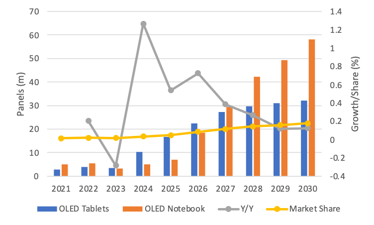 如下圖所示,OLED在2023年的份額很小,但出貨量在2024年開始增加,預計到2030年平板電腦將達3000萬臺,筆記本電腦將達5000萬臺。2023年游戲顯示器的出貨量約為100萬臺,但到2030年出貨量預計僅為 300 萬臺。