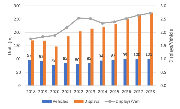 輕型汽車市場引起了顯示行業的關注,這并不是因為汽車的增長,而是因為每輛車的平均顯示器數量一直在增加,顯示器的尺寸也呈指數級增長。