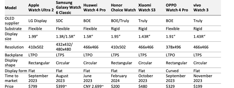 尺寸從1.1 英寸到2.0英寸不等,技術包括AMOLED、LCD、PMOLED和MicroLED。蘋果是 2023 年的主要供應商,占33% 的份額,其次是三星( 12%),華為(10%),三者均使用 OLED。友達光電推出了用于手表的 MicroLED 顯示屏,但產量很少。智能手表是蘋果試圖作為其所有顯示屏墊腳石的應用,但今年2月取消了這項耗資 30 億美元的計劃。