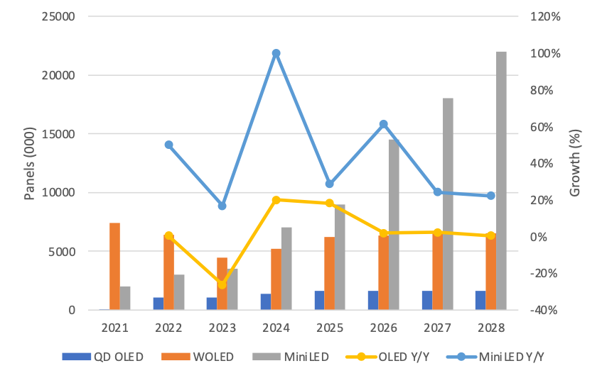 2021-2028年OLED與MiniLED電視出貨量、增長率(來源:Omdia、OLED-A)