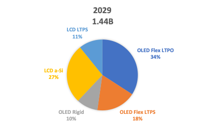 促成這一轉變的因素是可折疊面板產量的增加,從2023年的2300萬增加到2029年的1.2 億,占所有智能手機面板的15%,如下所示。