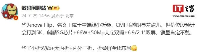 目前,華為(wei)(wei)Pocket 2的起售(shou)價為(wei)(wei)7499元,nova Flip的定價肯定要比這個價格便宜。據博主@數碼(ma)閑聊站 最新爆料,華為(wei)(wei) nova Flip 名(ming)義上屬于中端線小折疊,價位段(duan)預計會到(dao) 5000 元,搭載麒麟 5G 芯片 + 66W+50Mp 大底雙攝 + 6.9/2.1" 雙屏。