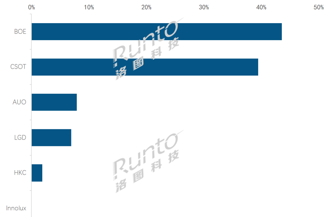 從不同廠商的占比情況看,自2020年LGD陸續關閉韓國境內的7.5和8.5代LCD面板廠,僅留廣州8.5代線體之后,大陸面板廠商BOE(京東方)和CSOT(華星光電)在高世代線的優勢就變的更加突出,成為大尺寸交互平板顯示面板市場的雙頭部供應商。