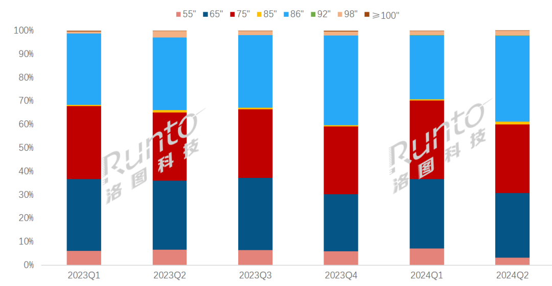 2023-2024Q2全球大尺寸交互平板顯示面板尺寸出貨量結構及變化