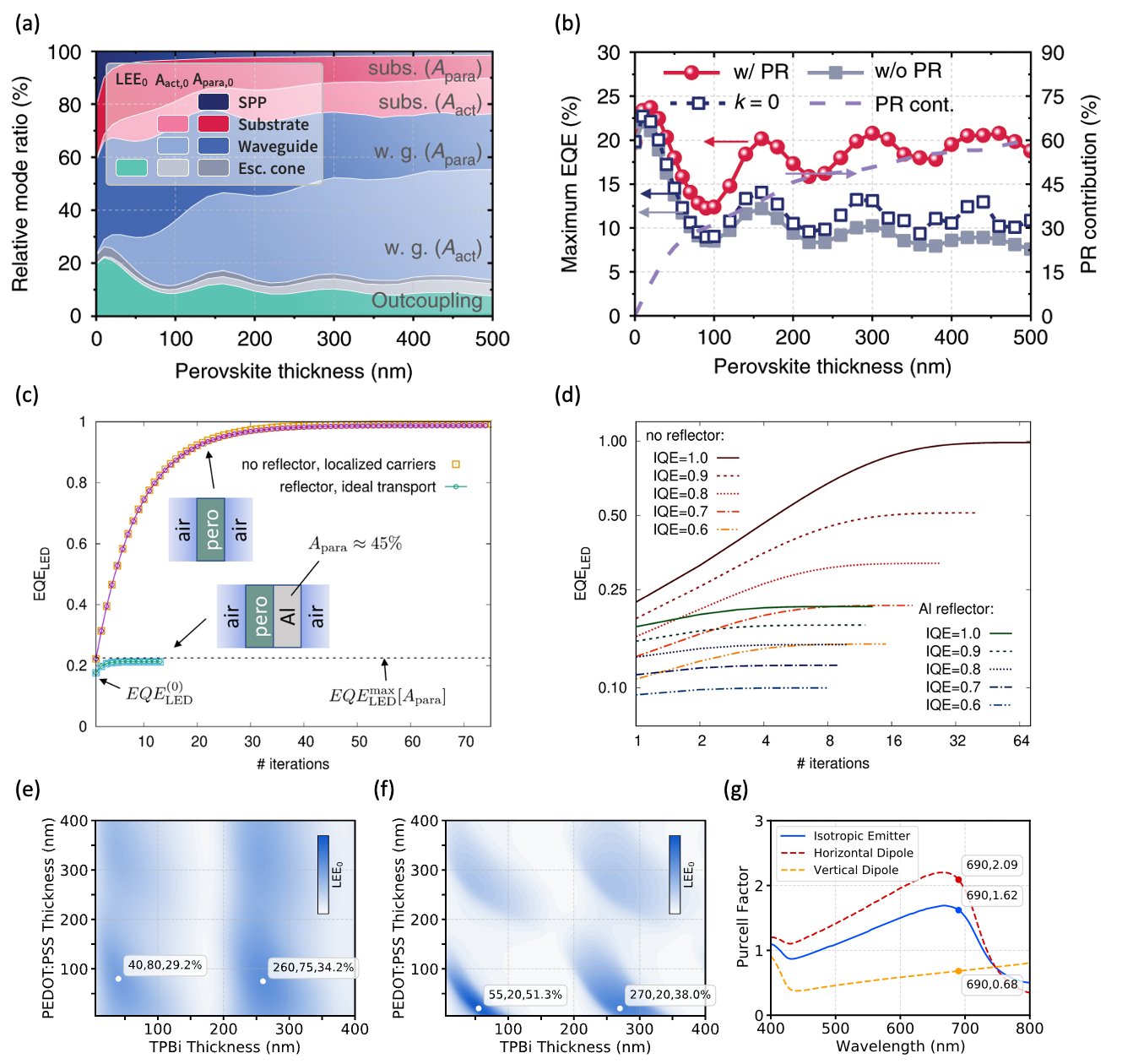 圖2 (a) 發光(guang)層厚度跟再吸(xi)收率(lv)(lv)的(de)(de)(de)關系 (b) 光(guang)子(zi)回收對(dui)(dui)效(xiao)率(lv)(lv)提升的(de)(de)(de)作(zuo)用 (c) 寄生吸(xi)收對(dui)(dui)光(guang)子(zi)回收的(de)(de)(de)影(ying)響 (d) 內量(liang)子(zi)效(xiao)率(lv)(lv)和(he)寄生吸(xi)收對(dui)(dui)光(guang)子(zi)回收的(de)(de)(de)影(ying)響 (e-f) 弱微(wei)腔(qiang)和(he)強微(wei)腔(qiang)中效(xiao)率(lv)(lv)的(de)(de)(de)優(you)化 (g) 微(wei)腔(qiang)中的(de)(de)(de)不(bu)同方向的(de)(de)(de)偶極(ji)子(zi)的(de)(de)(de)珀塞(sai)爾系數分離,對(dui)(dui)外(wai)耦(ou)合效(xiao)率(lv)(lv)和(he)內量(liang)子(zi)效(xiao)率(lv)(lv)都有提升作(zuo)用。