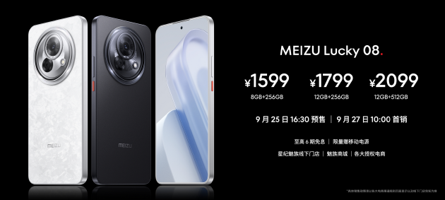 魅族 Lucky 08 擁有星耀白、隕石黑兩種配色,其中 8GB+256GB 版本售價 1599 元、12GB+256GB 版本售價 1799 元、12GB+512GB 版本售價 2099 元,購買可享至高 6 期免息。
