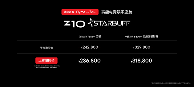 發布會上,星紀魅族與領克聯合打造的 Z10 電競定制版車型正式上市,分為 Z10 STARBUFF 95kWh 766km 和 Z10 STARBUFF 95kWh 680km 后驅版兩個配置,零售指導價分別為 24.28 萬元、32.98 萬元;上市限時價分別為23.68萬元、31.88萬元。11 月 30 日前完成大定鎖單,并于 12 月 31 日前完成提車的用戶可享受上市限時價。