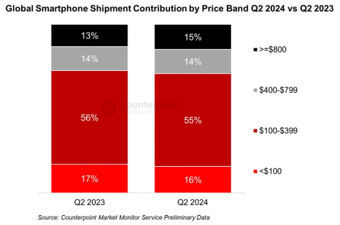 業內分析師指出,中端機在手機市場上能占到六七成的份額,一直是手機廠商爭奪的重要戰場。從消費市場來看,根據市場調研機構 Counterpoint Research 此前發布的 2024 年第二季度全球智能手機調研報告,從價位段發布來看,100 美元-399 美元(約合700-2900元人民幣)價位的手機仍然是全球智能手機市場的主力軍,占據了55%的市場份額。而這個價位段,也是榮耀 X 系列主攻的價位市場。