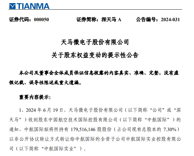 公(gong)告顯示(shi),深(shen)天(tian)馬于2024年6月20日(ri)披(pi)露了《關(guan)于股東(dong)權(quan)益(yi)變動(dong)的(de)提(ti)示(shi)性公(gong)告》、《簡(jian)(jian)式權(quan)益(yi)變動(dong)報告書(中(zhong)(zhong)(zhong)航(hang)(hang)(hang)(hang)國(guo)(guo)(guo)際(ji)(ji)(ji)(ji))》和《簡(jian)(jian)式權(quan)益(yi)變動(dong)報告書(中(zhong)(zhong)(zhong)航(hang)(hang)(hang)(hang)國(guo)(guo)(guo)際(ji)(ji)(ji)(ji)實(shi)(shi)業(ye)(ye))》,2024年6月19日(ri),中(zhong)(zhong)(zhong)國(guo)(guo)(guo)航(hang)(hang)(hang)(hang)空技(ji)術國(guo)(guo)(guo)際(ji)(ji)(ji)(ji)控股有(you)(you)限(xian)(xian)公(gong)司(si)(si)(si)(以下(xia)簡(jian)(jian)稱“中(zhong)(zhong)(zhong)航(hang)(hang)(hang)(hang)國(guo)(guo)(guo)際(ji)(ji)(ji)(ji)”)與中(zhong)(zhong)(zhong)航(hang)(hang)(hang)(hang)國(guo)(guo)(guo)際(ji)(ji)(ji)(ji)的(de)全(quan)資子公(gong)司(si)(si)(si)中(zhong)(zhong)(zhong)航(hang)(hang)(hang)(hang)國(guo)(guo)(guo)際(ji)(ji)(ji)(ji)實(shi)(shi)業(ye)(ye)控股有(you)(you)限(xian)(xian)公(gong)司(si)(si)(si)(以下(xia)簡(jian)(jian)稱“中(zhong)(zhong)(zhong)航(hang)(hang)(hang)(hang)國(guo)(guo)(guo)際(ji)(ji)(ji)(ji)實(shi)(shi)業(ye)(ye)”)簽署(shu)了《中(zhong)(zhong)(zhong)國(guo)(guo)(guo)航(hang)(hang)(hang)(hang)空技(ji)術國(guo)(guo)(guo)際(ji)(ji)(ji)(ji)控股有(you)(you)限(xian)(xian)公(gong)司(si)(si)(si)與中(zhong)(zhong)(zhong)航(hang)(hang)(hang)(hang)國(guo)(guo)(guo)際(ji)(ji)(ji)(ji)實(shi)(shi)業(ye)(ye)控股有(you)(you)限(xian)(xian)公(gong)司(si)(si)(si)關(guan)于天(tian)馬微(wei)電子股份有(you)(you)限(xian)(xian)公(gong)司(si)(si)(si)之股份轉(zhuan)(zhuan)讓(rang)協議》,中(zhong)(zhong)(zhong)航(hang)(hang)(hang)(hang)國(guo)(guo)(guo)際(ji)(ji)(ji)(ji)實(shi)(shi)業(ye)(ye)根據股權(quan)轉(zhuan)(zhuan)讓(rang)協議受(shou)讓(rang)中(zhong)(zhong)(zhong)航(hang)(hang)(hang)(hang)國(guo)(guo)(guo)際(ji)(ji)(ji)(ji)直接持有(you)(you)公(gong)司(si)(si)(si)的(de)179,516,146股股份(占公(gong)司(si)(si)(si)總股本(ben)的(de)7.30%),本(ben)次股權(quan)轉(zhuan)(zhuan)讓(rang)的(de)受(shou)讓(rang)方中(zhong)(zhong)(zhong)航(hang)(hang)(hang)(hang)國(guo)(guo)(guo)際(ji)(ji)(ji)(ji)實(shi)(shi)業(ye)(ye)受(shou)本(ben)次轉(zhuan)(zhuan)讓(rang)方中(zhong)(zhong)(zhong)航(hang)(hang)(hang)(hang)國(guo)(guo)(guo)際(ji)(ji)(ji)(ji)控制,且均為國(guo)(guo)(guo)有(you)(you)股東(dong),此次交易采用協議轉(zhuan)(zhuan)讓(rang)方式。