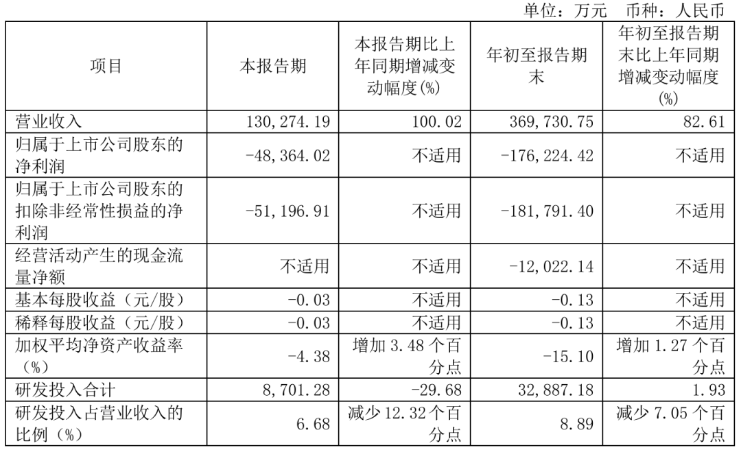 根據三季報,和輝光電第三季度單季度實現營業總收入13.03億元,同比增長100.02%,環比增長2.54%;歸母凈利潤-4.84億元,同比增長55.80%,環比增長24.09%;扣非凈利潤-4.56億元,同比增長59.00%,環比增長29.94%。