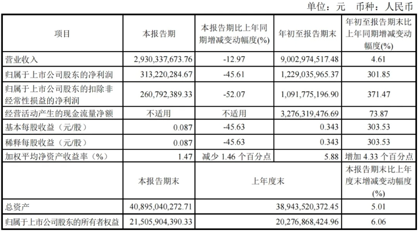 其中,第三季度歸屬上市公司股東的凈利潤3.13億元,同比下降45.61%。受市場需求增強等因素影響,液晶面板市場觸底反彈,產品價格上漲至2023年三季度,價格處于近年來相對高點;隨著市場供求關系變化,本報告期面板價格波動至相對低點,同時受美元匯率下跌影響,公司營業收入、歸屬于上市公司股東的凈利潤、每股收益同比減少,但年初至報告期末同比大幅度增長。
