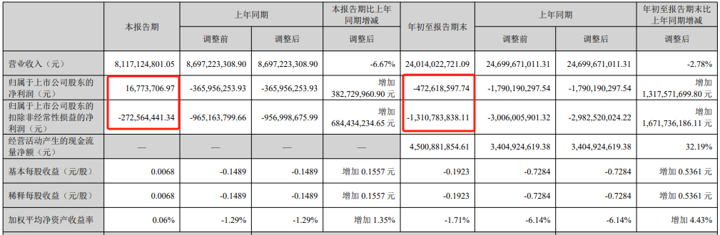 維信諾今年前三季度公司實現營業收入58.47億元,同比增長41.95%;歸屬于上市公司股東的凈利潤虧損17.97億元,同比增長29.22%;扣除非經常性損益后的凈利潤虧損19.65億元,同比增長23.76%。