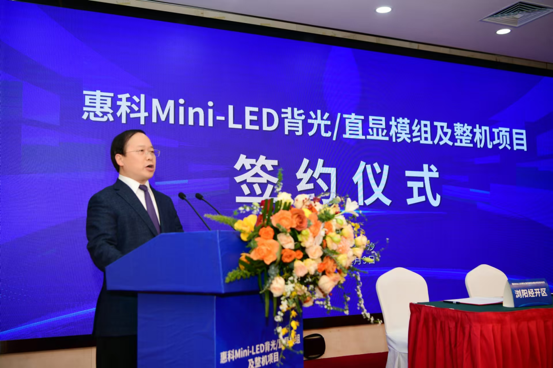 肖正波在致辭時表示,惠科光電自2019年落戶瀏陽經開區以來,不斷開疆拓土、高歌猛進,成為瀏陽兩個百億級企業之一,與瀏陽相互成就、比翼齊飛。在省委省政府、長沙市委市政府和各級領導的傾心關懷、鼎力支持下,此次惠科Mini-LED背光/直顯模組及整機項目簽約落戶瀏陽經開區,是惠科公司和瀏陽雙向奔赴、互利共贏的結果,必將助力企業搶占產業制高點,助力瀏陽加快發展新質生產力。瀏陽將以打造“六好”營商環境為主抓手,創造最佳條件、提供最強保障,一如既往地為企業發展保駕護航,確保項目全速往前推進、盡早點亮投產,助力惠科公司在瀏陽這片沃土上再攀高峰、再創輝煌。