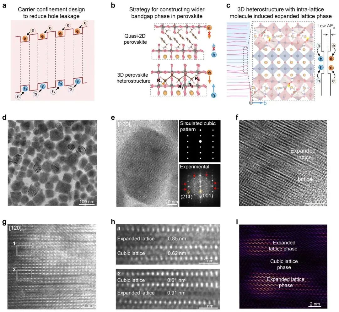 姚宏斌(bin)團(tuan)隊提出一(yi)種新的(de)(de)材料結構(gou)設(she)計——“三維鈣(gai)(gai)鈦(tai)(tai)礦異質結”有(you)效抑(yi)制了(le)空穴(xue)(xue)泄(xie)漏。團(tuan)隊在鈣(gai)(gai)鈦(tai)(tai)礦晶(jing)格內部插入(ru)有(you)機分(fen)子,改變發光(guang)層晶(jing)體結構(gou),構(gou)建了(le)阻攔(lan)空穴(xue)(xue)離開(kai)發光(guang)層的(de)(de)“水壩”——“寬帶隙能壘”,在實現載流子限(xian)域的(de)(de)同時(shi),保持高遷移率(lv)。姚宏斌(bin)教授聯合胡偉(wei)教授對這(zhe)一(yi)創新型設(she)計進行了(le)理(li)論結構(gou)分(fen)析,林岳教授則利(li)用球差電鏡充(chong)分(fen)驗證了(le)這(zhe)一(yi)材料。