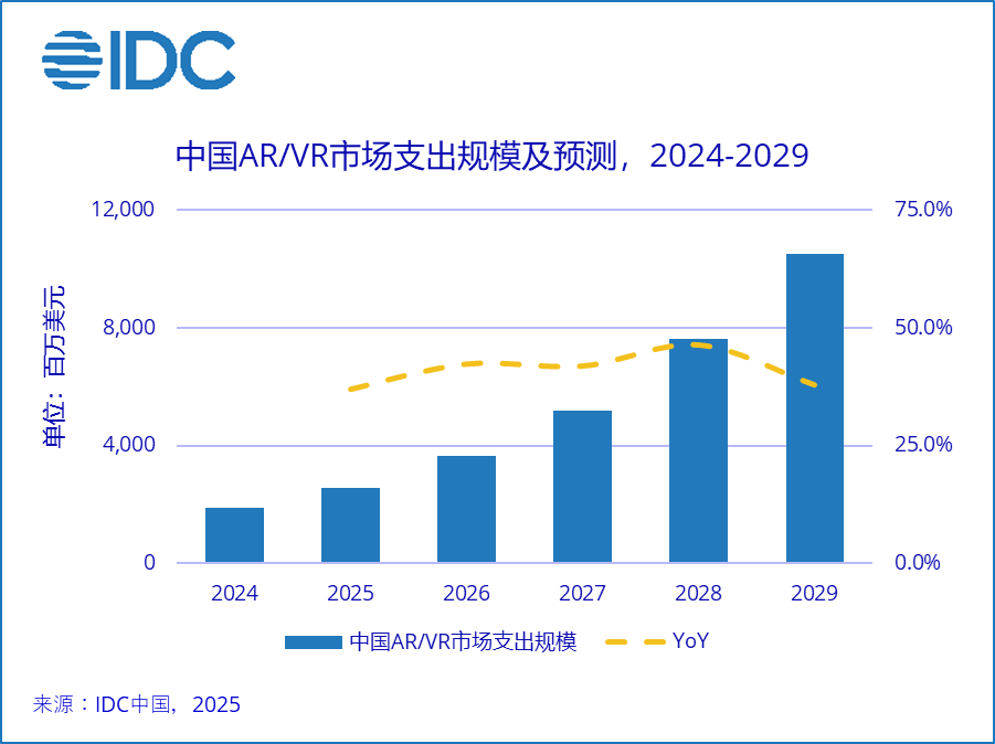硬件方面,IDC將頭戴設(she)備類型分(fen)為增強現實(AR)、擴展(zhan)(zhan)現實(ER)、混合現實(MR)和(he)虛擬現實(VR)。MR成為AR/VR硬件市場中占(zhan)比最大(da)、增速(su)最快(kuai)的子(zi)市場,到2029年(nian)投資規(gui)模將超(chao)25億美元。MR設(she)備因(yin)為能同時處理虛擬和(he)現實世界的交互,正改變多個行業(ye)的運作方式(shi),這種既能“虛實結(jie)合”又方便實用的特點使其(qi)成為驅動AR/VR硬件市場增長(chang)的主引(yin)擎(qing)。反觀(guan)VR市場,其(qi)發展(zhan)(zhan)軌跡呈衰退態勢,IDC預測,到2028年(nian)傳統VR設(she)備將基本退出中國市場。