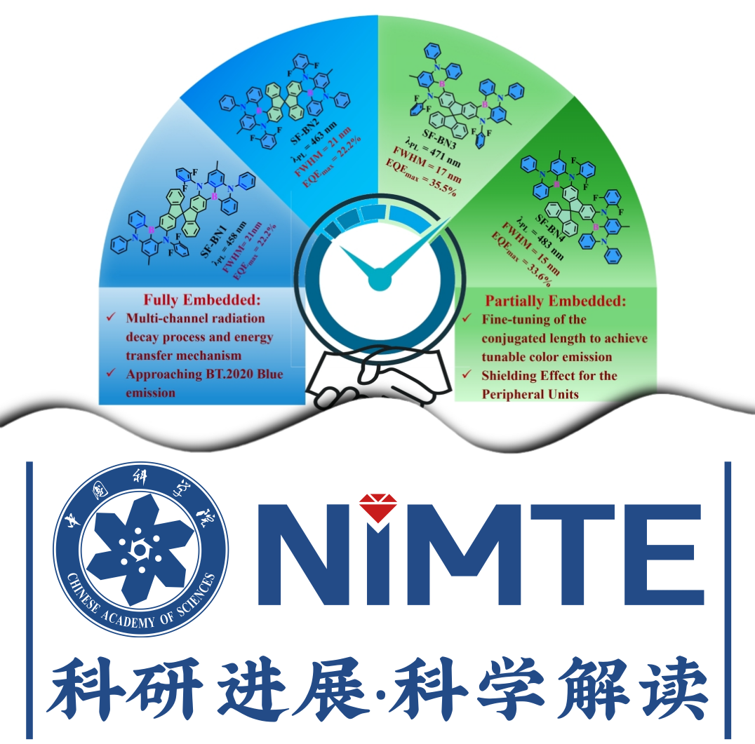 近期,中國科學院寧波材料技術與工程研究所有機光電材料與器件團隊葛子義研究員、李偉副研究員,聯合華南理工大學蘇仕健教授提出一種分子設計策略,將剛性 9,9'-螺雙[芴](SF)單元全部或部分整合到B/N-分子內電荷轉移(MR)發光核心中(圖1),成功開發了含螺芴的MR-TADF材料體系SF-BN1、SF-BN2、SF-BN3 和 SF-BN4,它們具有高色純度和高效率的特性。對于完全嵌入 B/N-MR 核心的發光體SF-BN1和SF-BN2,SF中的sp3雜化碳(tan)原子將(jiang)每個(ge)(ge)分(fen)子分(fen)成對稱的(de)(de)(de)部分(fen),形成兩個(ge)(ge)獨立且(qie)剛性(xing)的(de)(de)(de)B/N-MR 發(fa)光(guang)(guang)中心。這阻(zu)礙了共軛(e)結構,降低了共軛(e)長度,發(fa)射出(chu)深藍光(guang)(guang),并通過多通道輻(fu)射衰(shuai)減過程和(he)(he)能量轉移(yi)機(ji)制顯(xian)著提高了材料效率(lv)。對于部分(fen)嵌入(ru)B/N-MR 核(he)心的(de)(de)(de)發(fa)光(guang)(guang)體(ti)SF-BN3 和(he)(he) SF-BN4,芴嵌入(ru)的(de)(de)(de) B/N-MR 核(he)心可(ke)以連接B/N2[4]螺旋烯亞單元,形成剛性(xing)分(fen)子框架(jia)。值(zhi)得注意的(de)(de)(de)是,SF-BN1、SF-BN2、SF-BN3 和(he)(he) SF-BN4 在稀釋的(de)(de)(de)甲(jia)苯(ben)溶液中實現了最小的(de)(de)(de)半峰全寬(FWHM)值(zhi)分(fen)別(bie)為17 nm、21 nm、17 nm和(he)(he)15 nm,并且(qie)在摻雜薄膜中高光(guang)(guang)致(zhi)發(fa)光(guang)(guang)量子產率(lv)高達90%,這表明(ming)它(ta)們具有(you)出(chu)色的(de)(de)(de)電致(zhi)發(fa)光(guang)(guang)(EL)潛(qian)力(li)。基于 SF-BN1、SF-BN2、SF-BN3 和(he)(he) SF-BN4 的(de)(de)(de)相應超熒(ying)光(guang)(guang)有(you)機(ji)發(fa)光(guang)(guang)二(er)極管(HF-OLED)峰值(zhi)外量子效率(lv)(EQE)分(fen)別(bie)達到了29.0%、22.2%、35.5%和(he)(he)33.6%,對應的(de)(de)(de) CIE 坐標分(fen)別(bie)為(0.13,0.08)、(0.11,0.15)、(0.13,0.23)和(he)(he)(0.12,0.35),FWHM 值(zhi)分(fen)別(bie)為 23 nm、32 nm、26 nm和(he)(he) 40 nm。