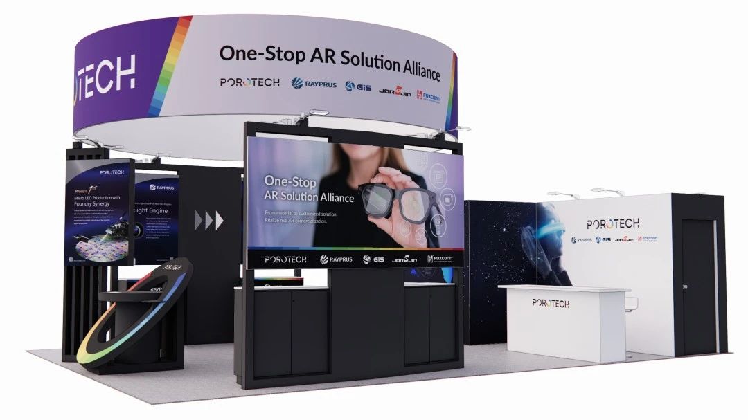 Porotech領銜「AR智造聯盟」,攜手鴻海等四大產業伙伴聯合展出完整呈現從材料、光機、光學模塊、AR眼鏡到整機組裝與量產的一站式AR解決方案。